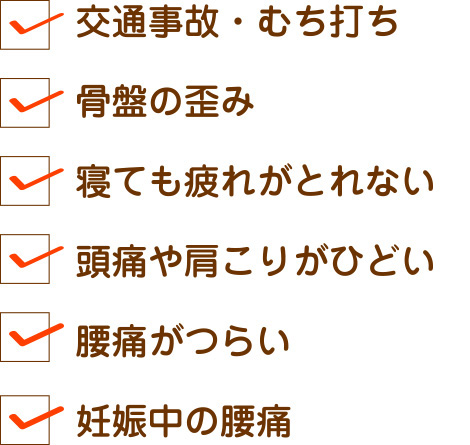 また、交通事故後の身体の痛みといった不調にも対応しています。お気軽にご相談ください。